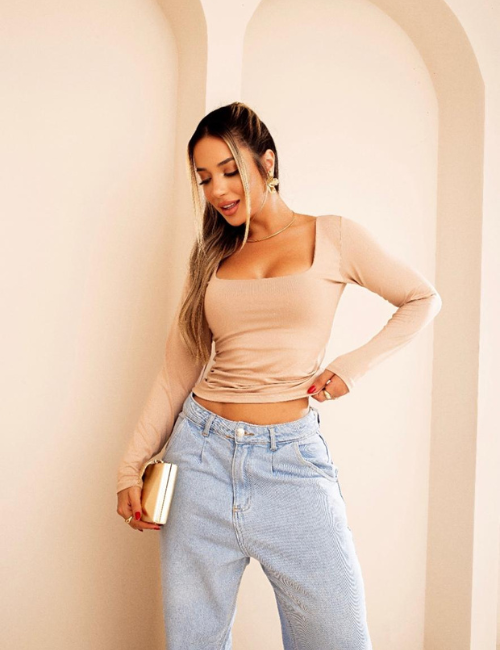 Com decote quadrado que valoriza o colo e mangas longas ajustadas, ela traz um toque sofisticado e moderno para qualquer ocasião.