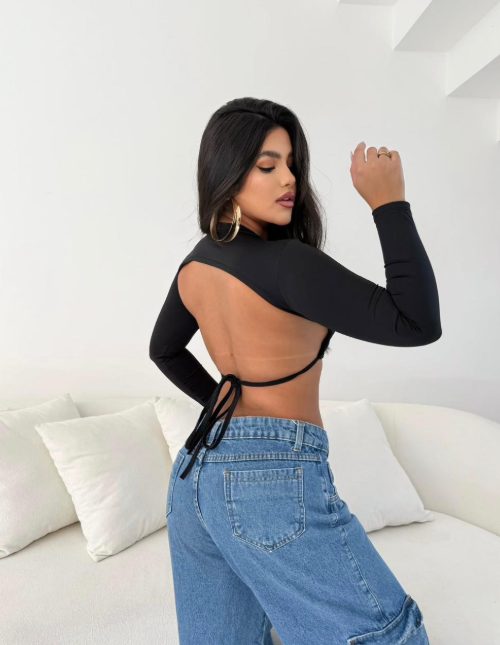 Com mangas longas, costas abertas e amarração ajustável, esse modelo é ousado na medida certa, valorizando suas curvas com muito charme e conforto.