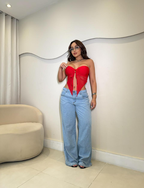 Com design tomara que caia e detalhe em tule transparente, ele traz um toque moderno e ousado, perfeito para compor produções noturnas ou fashionistas.